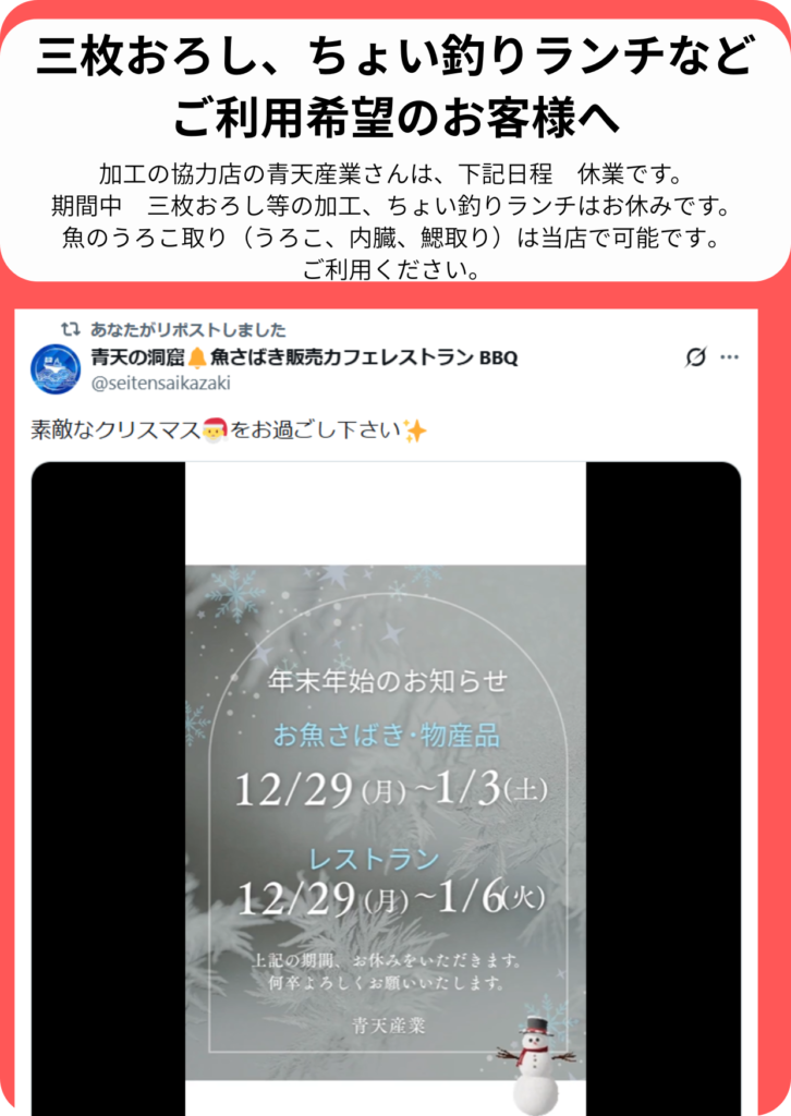 魚さばき加工の協力店「青天産業」さんの年末年始休業のご案内です。