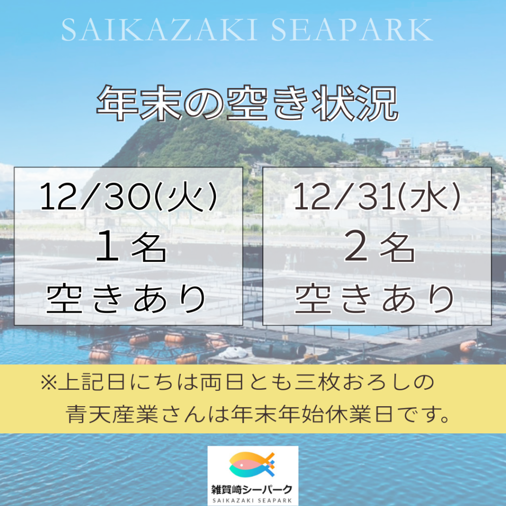 12/30(火) 1名 空きあり!12/31(水) 2名 空きあり!