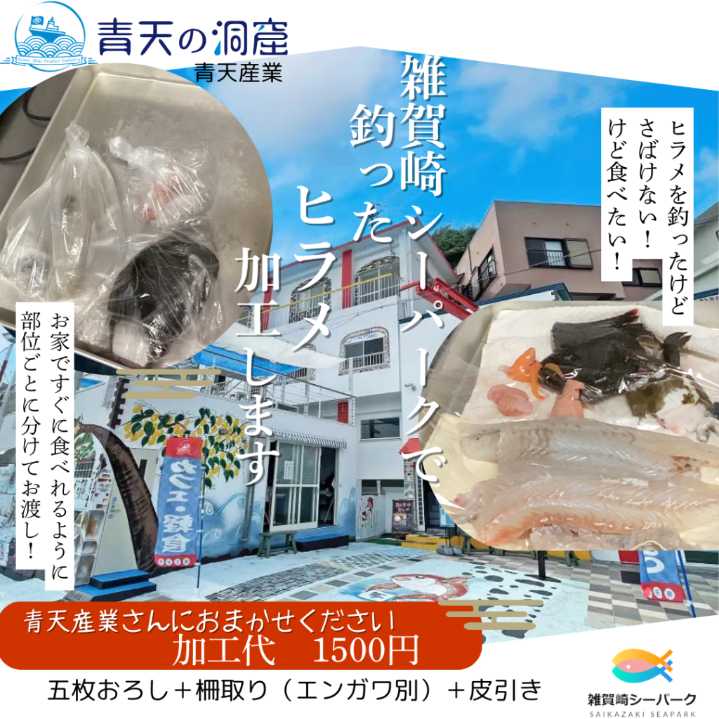 予約制釣り堀で、ヒラメを放流しています。釣れても三枚おろしが、、、という場合は協力店の青天産業をご利用ください。
